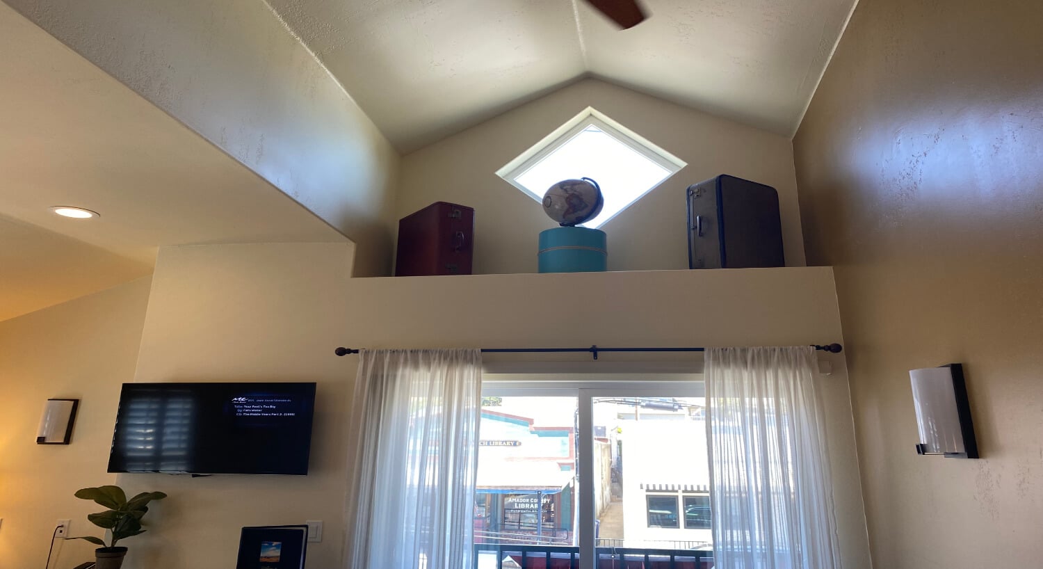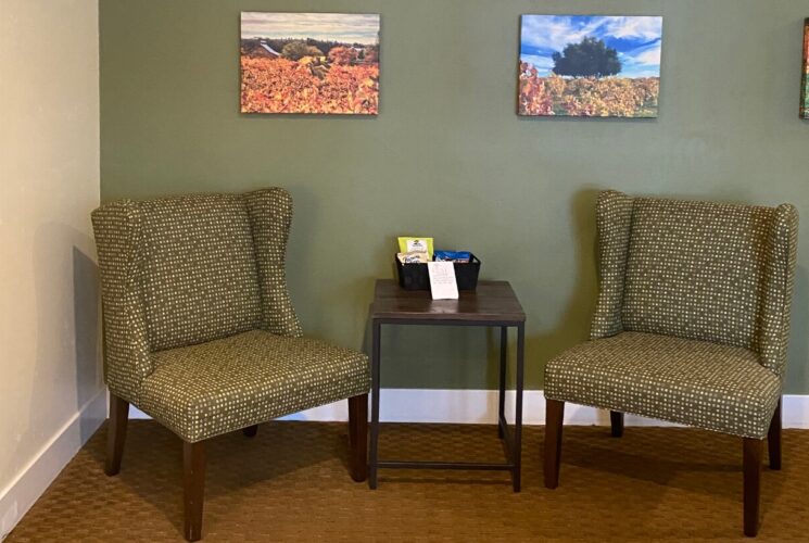 This room offers two entrances and exits from the main lobby and directly onto Main Street. There is also access to the main lobby and the room from the parking lot in the back via a lift adjacent to the ADA parking space. The bathroom features a roll-in shower with shower seat and removable shower head, a sink with clearance underneath, and a toilet with grab bars on the side and back. The closet has the hanging rod at an accessible level. The beds are at an accessible height, and there is room to move around comfortably in the room in a wheelchair. Our staff is happy to offer any additional assistance in making special accommodations for you during your visit.
